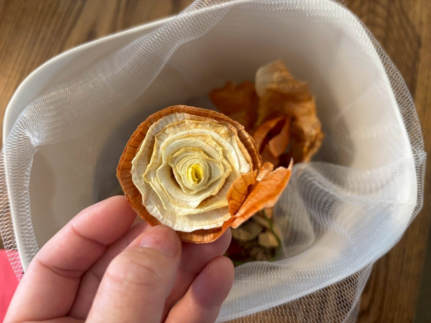 乾燥後の生ごみはパリパリで腐らないため、長期間保存が可能。ためてから一度に捨てられるので手間も減ります。ごみ袋が軽くなるうえ、我が家では可燃ごみを出す回数が3分の1に減りました。