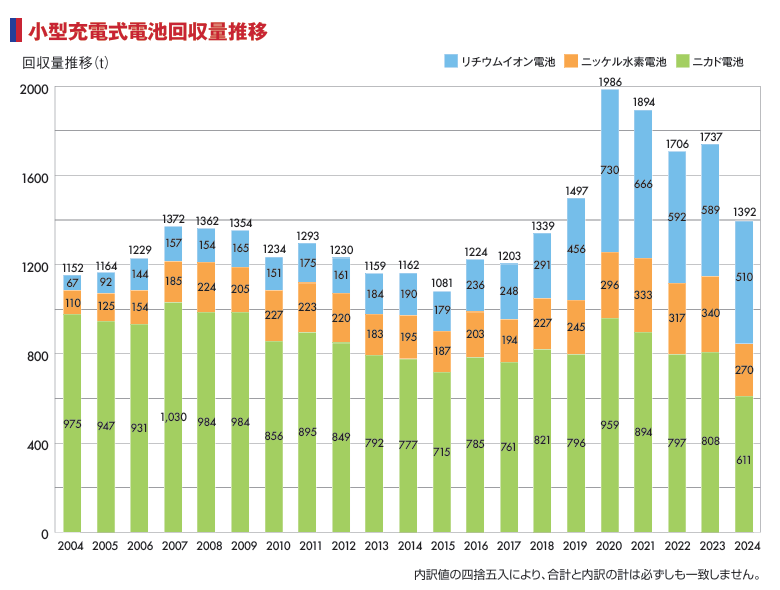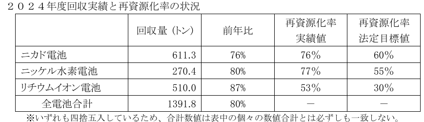 そうですね。私たちJBRCでは2024年度に1,391.8トンの小型充電式電池を回収しました。そのうちリチウムイオン電池は510.0トンでした。再資源化については53%と、法定目標の30%を大きく上回っています。