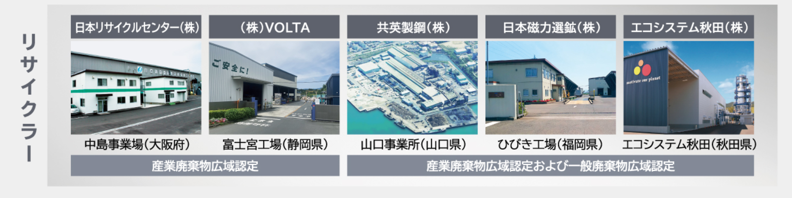 北は秋田県から南は福岡県までの全国5か所のリサイクラーと処理委託契約を結んでいます。安全対策・環境対策を徹底したうえで適正に処理しています。