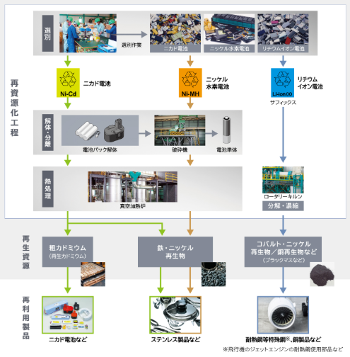 電池種毎に最適な工程を経て、ニッケル、鉄、カドミウム、コバルトなどの資源に再生しています。これらはステンレス製品や電池、耐熱鋼等特殊鋼などの原料として再び活用されています。