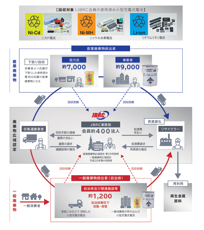 日本では廃棄物を回収・処理するには本来は自治体や許可事業者しか取り扱えないというルールがあります。しかし、リサイクルの重要性が高いリチウムイオン電池などは、廃棄物処理法の特例制度としてメーカーが広域的に自社の製品を回収できるようにする「広域認定制度」が設けられています。JBRCは一廃、産廃の広域認定を得て回収と再資源化を行っています。