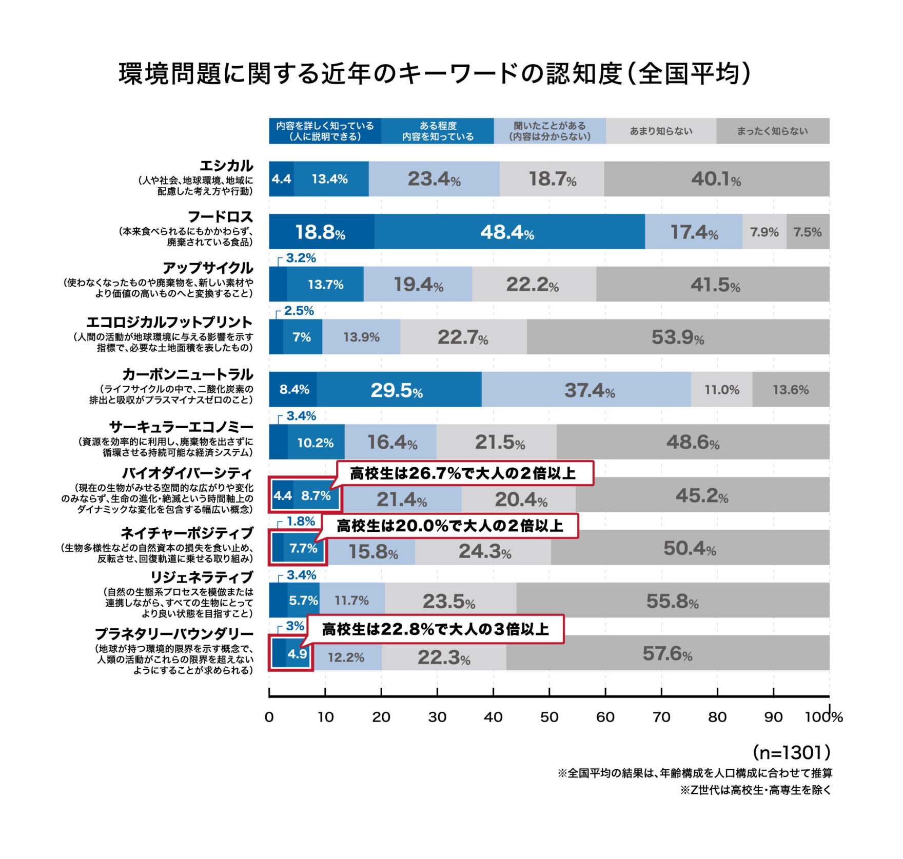 今回の調査で最も印象的だったのは、高校生世代の存在感です。「バイオダイバーシティ」「ネイチャーポジティブ」「プラネタリーバウンダリー」といった近年のキーワード認知で、高校生は大人の3倍超。「内容まで把握」の比率でも高校生が上回り、概念理解の厚みが伺えます。「バイオダイバーシティ」「ネイチャーポジティブ」「プラネタリーバウンダリー」といった近年のキーワード認知で、高校生は大人の3倍超。「内容まで把握」の比率でも高校生が上回り、概念理解の厚みが伺える調査結果となっておりました。
