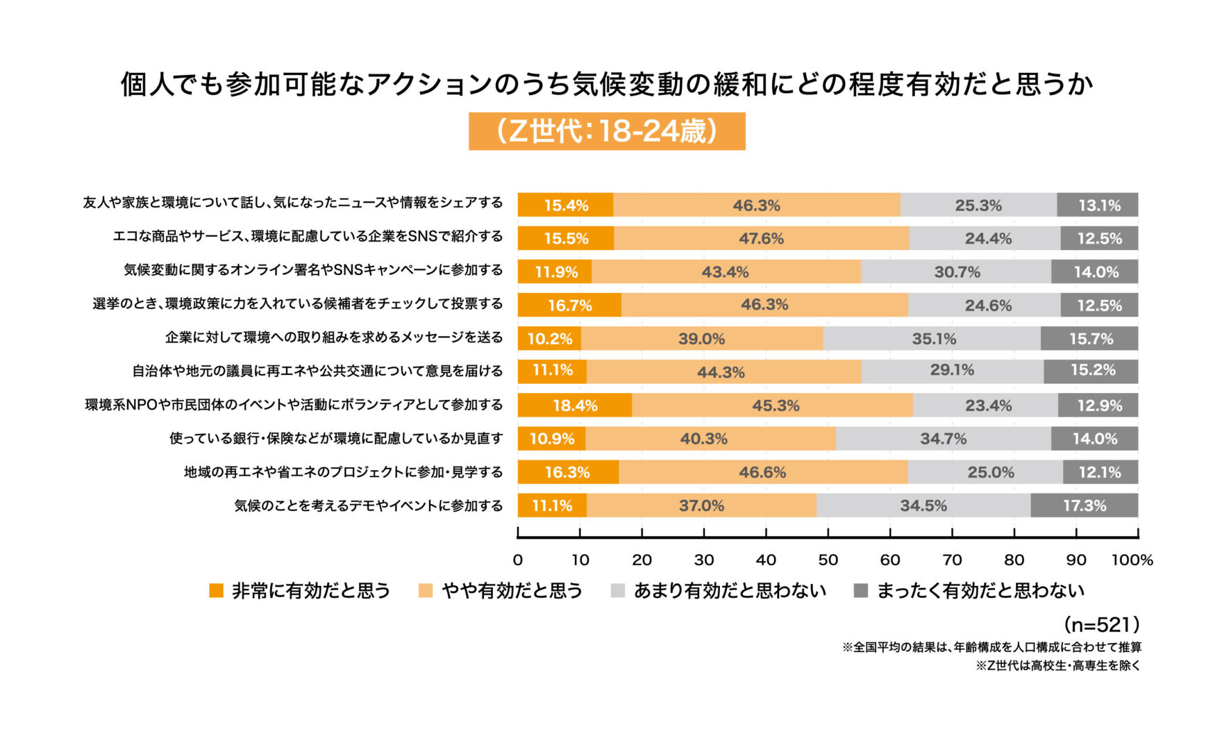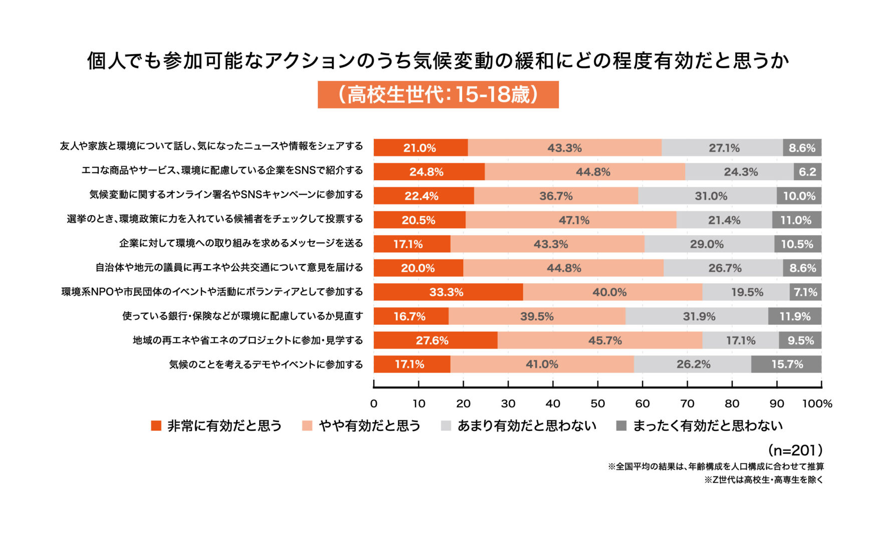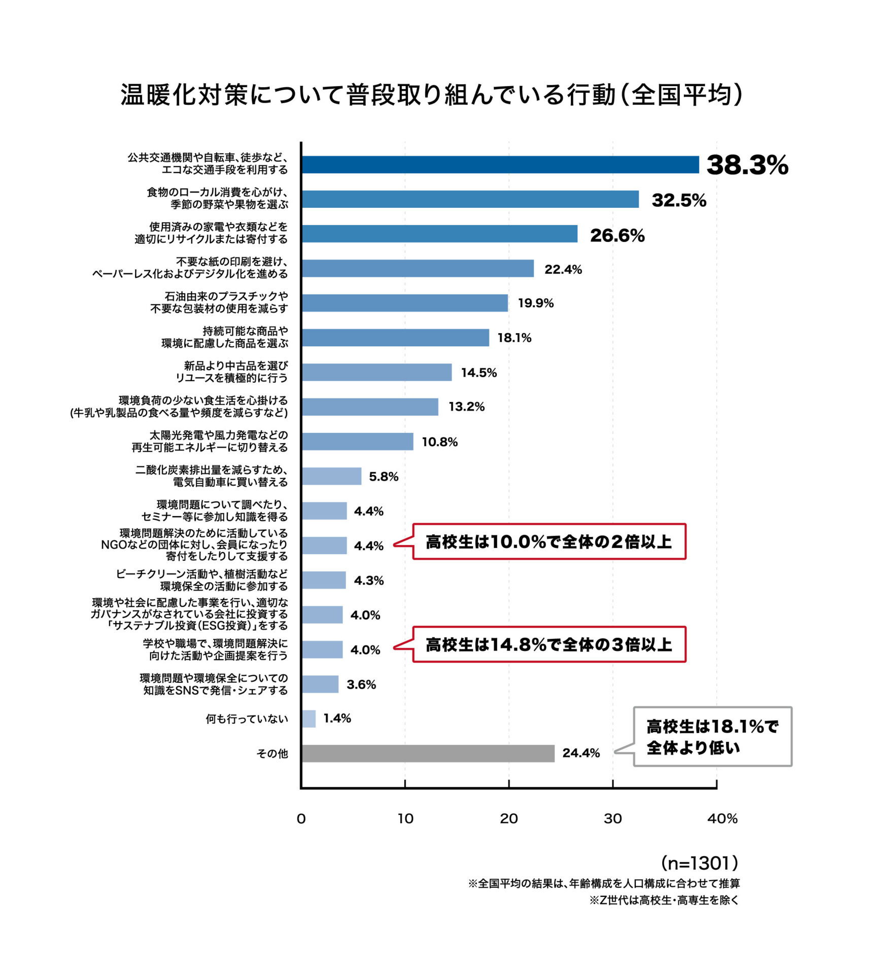 最大のトピックは、高校生世代の新規追加です。2022年度から高校で必修化された「総合的な探究の時間」等に伴い、気候変動や生物多様性、資源循環を学ぶ機会が拡大。学習→地域・学校での企画提案→実践という循環が、今回のデータにはっきりと表れました。