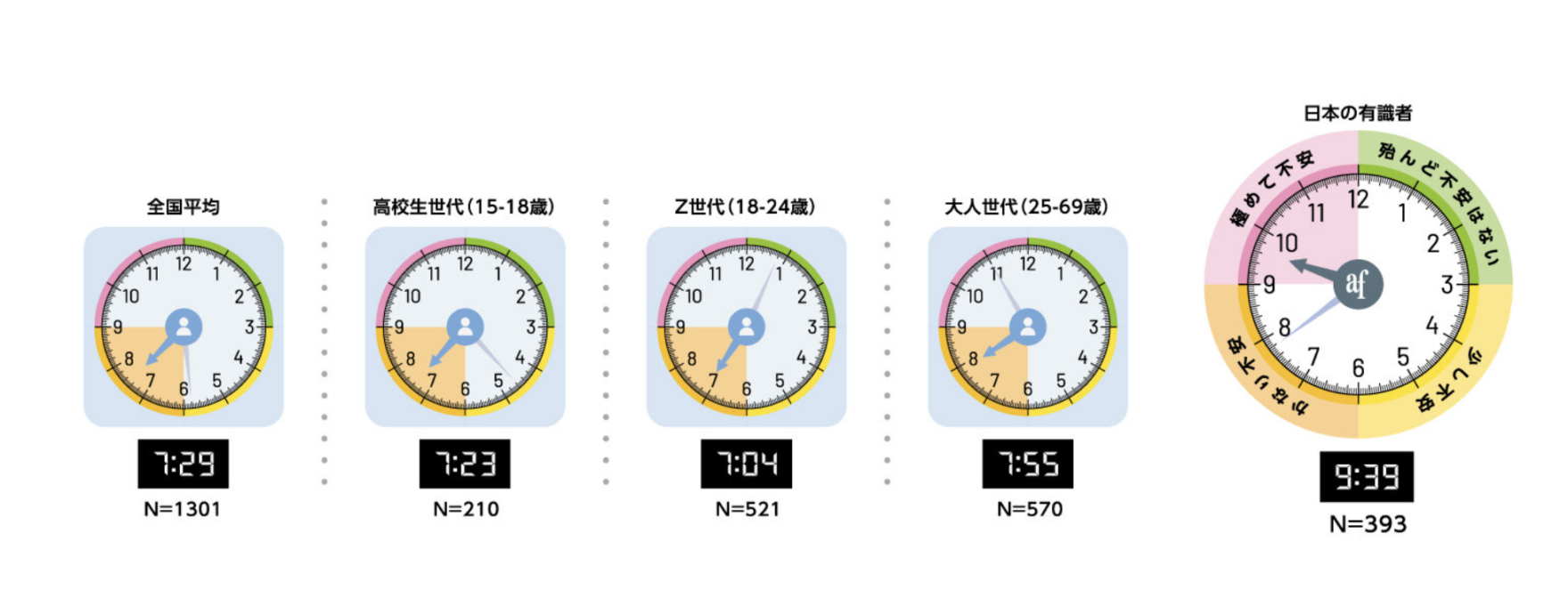 象徴的なのが環境危機時計。全国平均は「7時29分」で、昨年から30分進行(評価は「かなり不安」)。世代別では、高校生7:23、Z世代7:04、大人7:55で、大人のほうが危機感が強い一方、高校生はZ世代より高いというねじれも見られます。