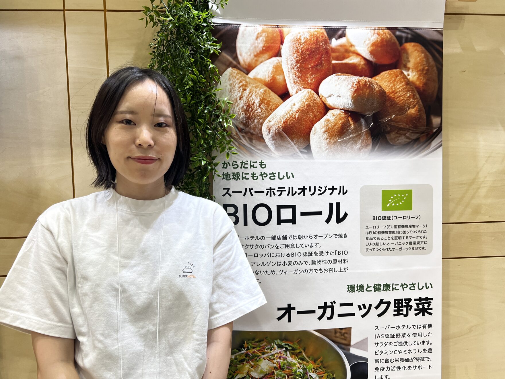 「Natural,Organic,Smart」をコンセプトに、健康でサステナブルなライフスタイルを提案するスーパーホテルでは、オーガニックでヘルシーな朝食の提供にもこだわっています。焼きたてパンのラインナップには、BIO認証を受けた有機農法による原材料で製造されたオリジナルのロールパン「BIOロール」があります。そのほか有機JAS認証野菜を使用したサラダ、有機大豆を使用した味噌汁など、環境や健康に配慮した食材を朝食メニューとして積極的に取り入れています。(一部店舗を除く)