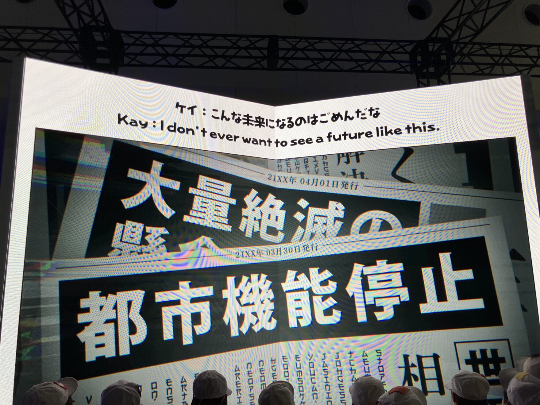 会場に足を踏み入れると暗闇の中で始まるのが『科学漫画サバイバル』の世界へと誘うアニメーション。サバイバルの達人である主人公ジオたちとともにノウ博士の研究所を訪れたわたしたちに"未来からのSOS"が届きます。メッセージとともに転送された映像に記録されていたのは、気候変動による海面上昇や生態系の破壊。干ばつによる食糧危機。森林や鉱物といった資源の激減。ゴミによる環境汚染と、現代を生きるわたしたちが大量にものを作っては捨てることを繰り返した結果、人類が存続の危機に陥った未来でした。