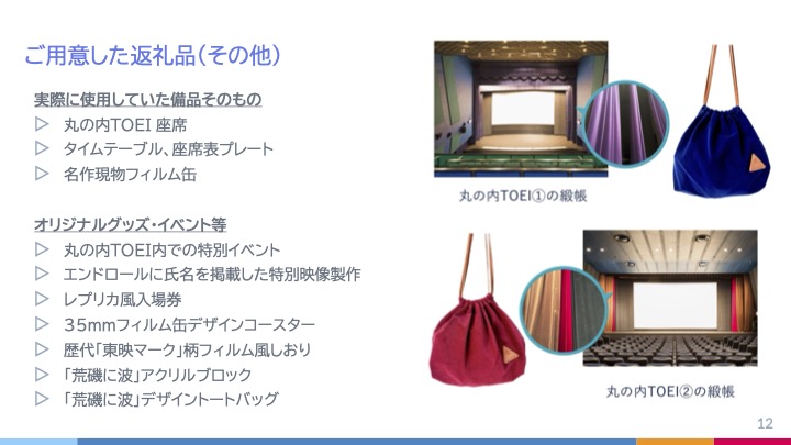 また、返礼品の中で個人的なお気に入りはありますか? との質問には、両氏より「やはりパッチワークスツールですね。3つの座席の柄を組み合わせたデザインが可愛らしく、工程がかかるため設定金額は高かったのですが、思い入れのある方が多かったと思います。映画館の中と外では光の当たり方で色合いの印象も変わり、閉鎖空間から出て新しいものに生まれ変わった証しのように感じました」とお話しいただきました。