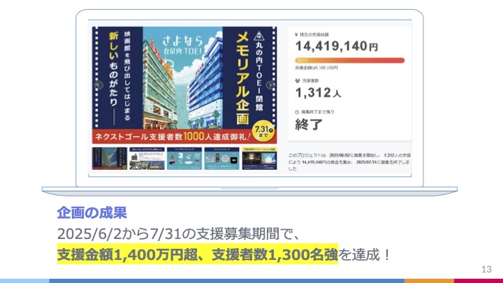 クラウドファンディングは大きな成果を上げました。最終達成額は1,441万円、支援者数は1,312名にのぼりました。中田氏によれば、こうした映画館の閉館とアップサイクルをかけ合わせたクラウドファンディングで、これだけの支援を集めたのはCAMPFIREとしても初めてのことだったそうです。