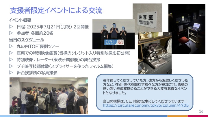このプロジェクトを取材執筆したCE.Tライターの青葉氏からは、「東映さんならではの強み、映画作品というものが、個人の体験や記憶、過去作品へのオマージュやリスペクトといった素材を再活用して新しい物語に生まれ変わらせる、いわば心のアップサイクルのような表現だからこそ成功したのだと感じました。映画は作品という資源を繰り返し上映することで、人々の心に物語を循環させ未来につなぐ文化という側面があります。それを映画館のアップサイクルにうまく落とし込んだことが成功につながったのでは」と感想が寄せられました。