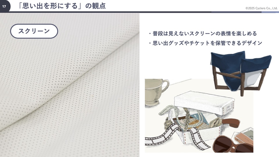映画館の象徴であるスクリーンは小物入れやバスケットの生地として使用されました。島田氏によれば、スクリーンは間近で見ると音を通すための細かい穴があり、普段見ることのない表情があるといいます。小物入れは、実際にスクリーンに触れながら丸の内TOEIの思い出グッズやチケットを保管できるようデザインされました。