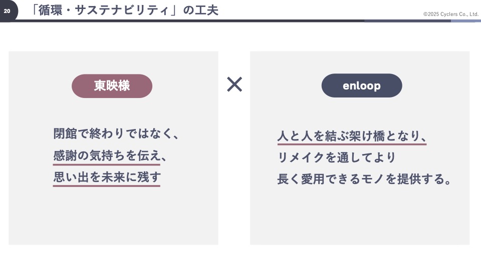 そして3つ目に「新しい物語の始まり」です。東映のスローガン「愛される物語を全世界に」になぞらえ、映画館の閉館という悲しい文脈を、廃棄物に新たな命を吹き込む前向きな企画として発信できたと成果を示しました。