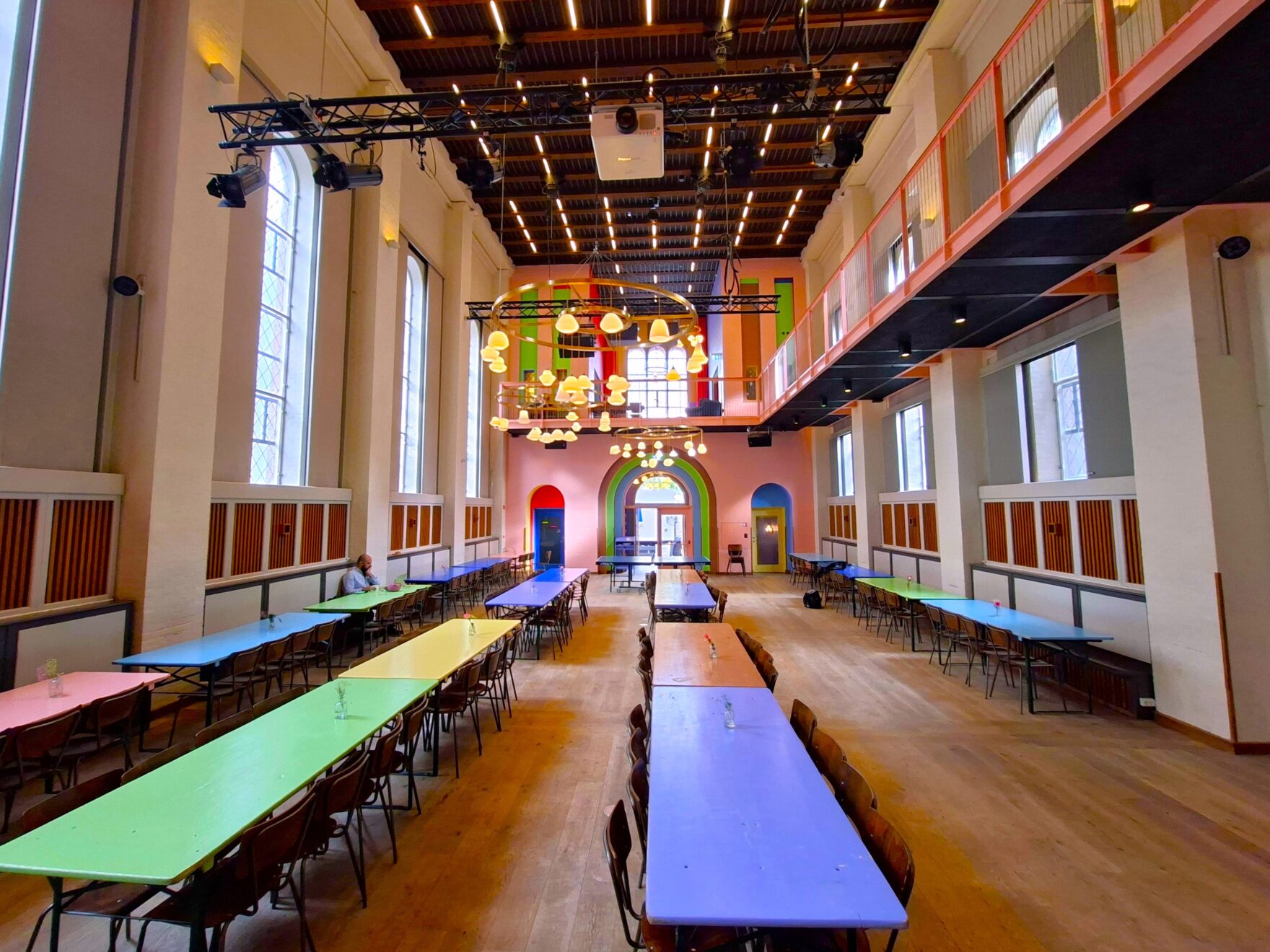中に入ると、多色使いの壁やテーブルに驚かされます。エントランスや階段、ホールや元は聖壇だったステージ、地下にあるトイレまでカラフルです。家具は教会の椅子を使ったり、蚤の市で見つけたものだそうです。教会特有の強い残響音は、天井の吸音パネルや長いカーテンによって解消されました。