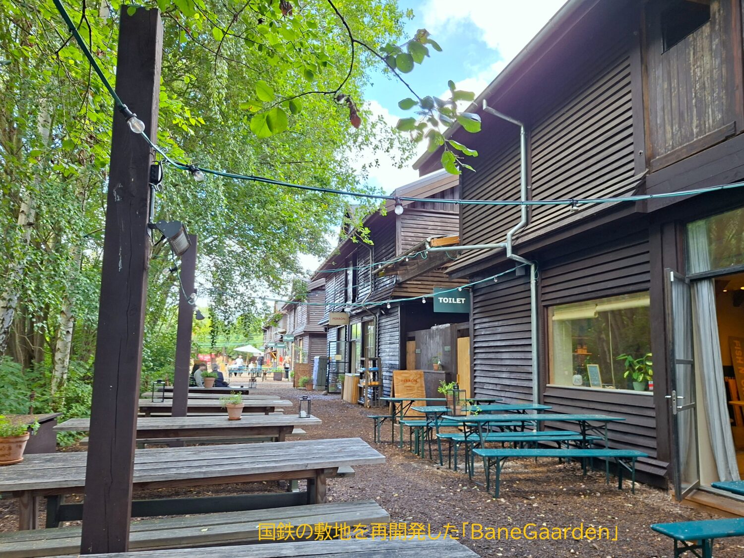 バーネゴーデン(BaneGaarden)はサッカー場2.5面分もの敷地を誇る、隠れ家的な憩いの場です。自然、オーガニックフード、様々なイベントを1年中楽しめます。古く粋な風合いの茶色い建物には、カフェや屋台が入っています。これらは 1909年にデンマーク国鉄DSBによって建てられた納屋で、、何十年も放置されていました(屋根が崩壊するなど、劣化が激しかった)。それが「ここで持続可能性な活動を実践していこう」という理念をもった起業家たちのおかげで、徹底的に修復されたのでした。