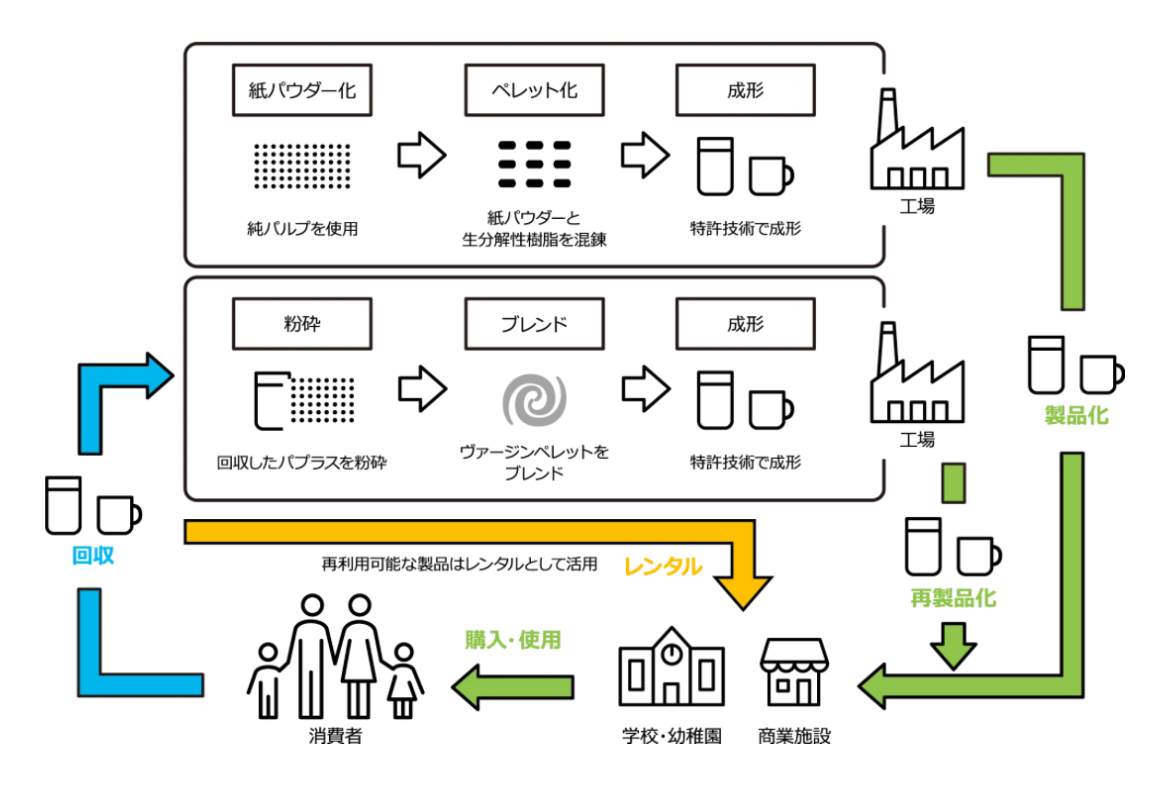 『パプラス』シリーズは、製品を「土に還す」ことではなく、使用後に回収・再製品化することで、資源として循環し続ける仕組みを目指しているとのこと。
