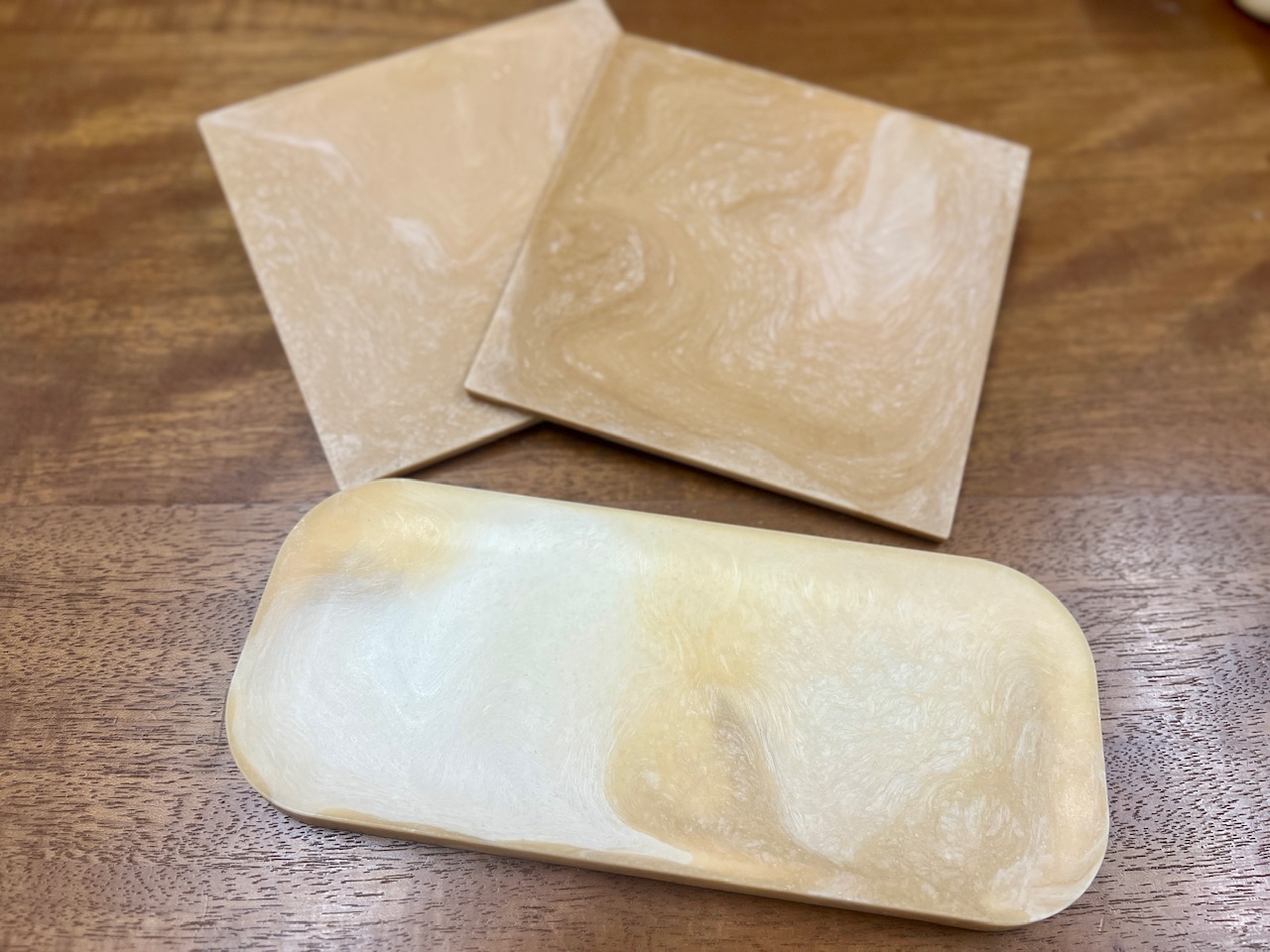 ソフトバンク社に提供する『パプラスビズ』は耐熱性が約140度まであり、電子レンジも使えるという耐久性を追求するため、PLAのみで作られていますが、もともと、「カミーノ」の得意とする商品は、紙とPLAを組み合わせることでできた、これまでにない斬新なマーブル柄の風合いが出るバイオプラスチックです。