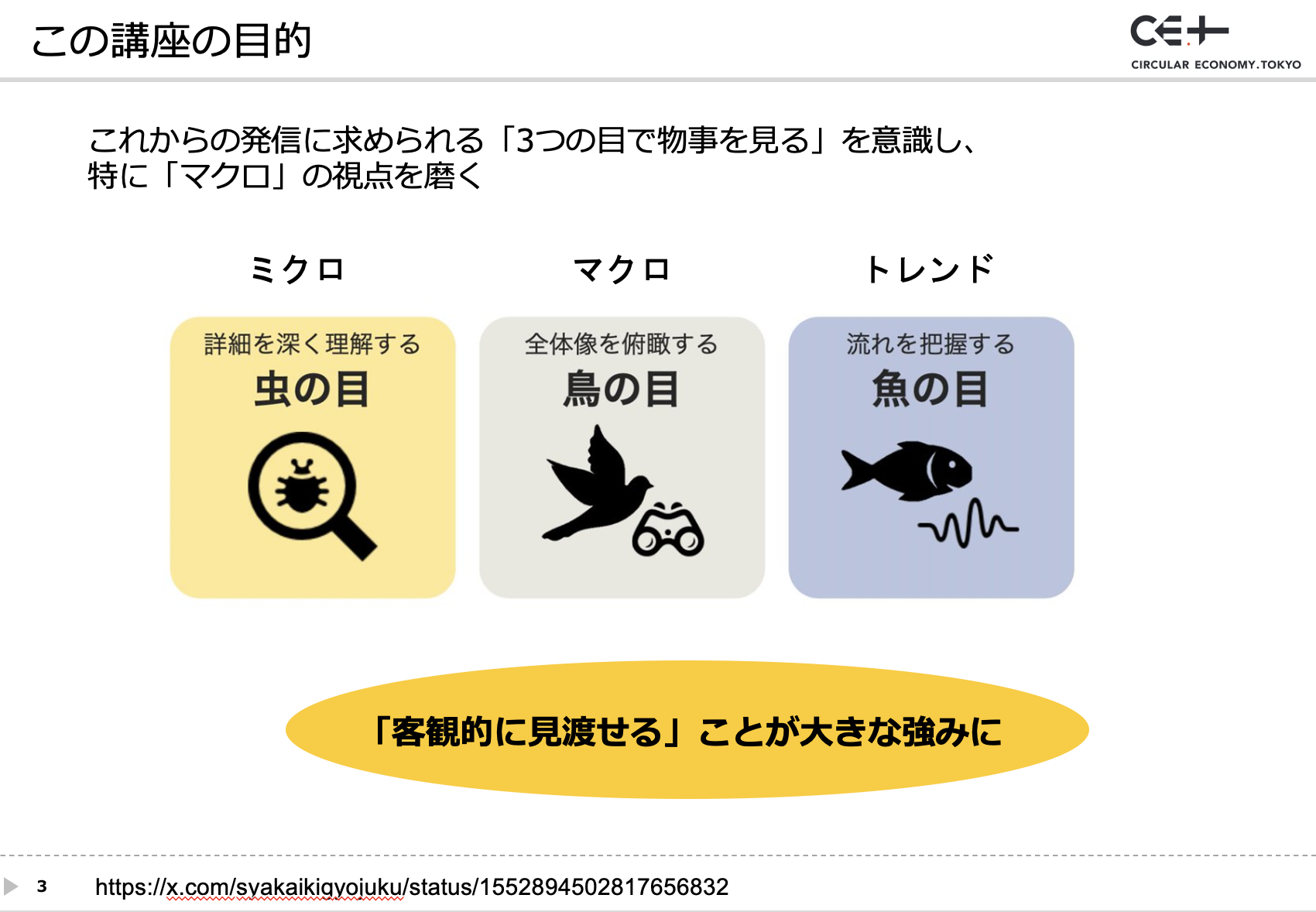「ミクロ」「マクロ」「トレンド」という3つのレンズを使って、発信や事業の方向性を考える力を養います。
