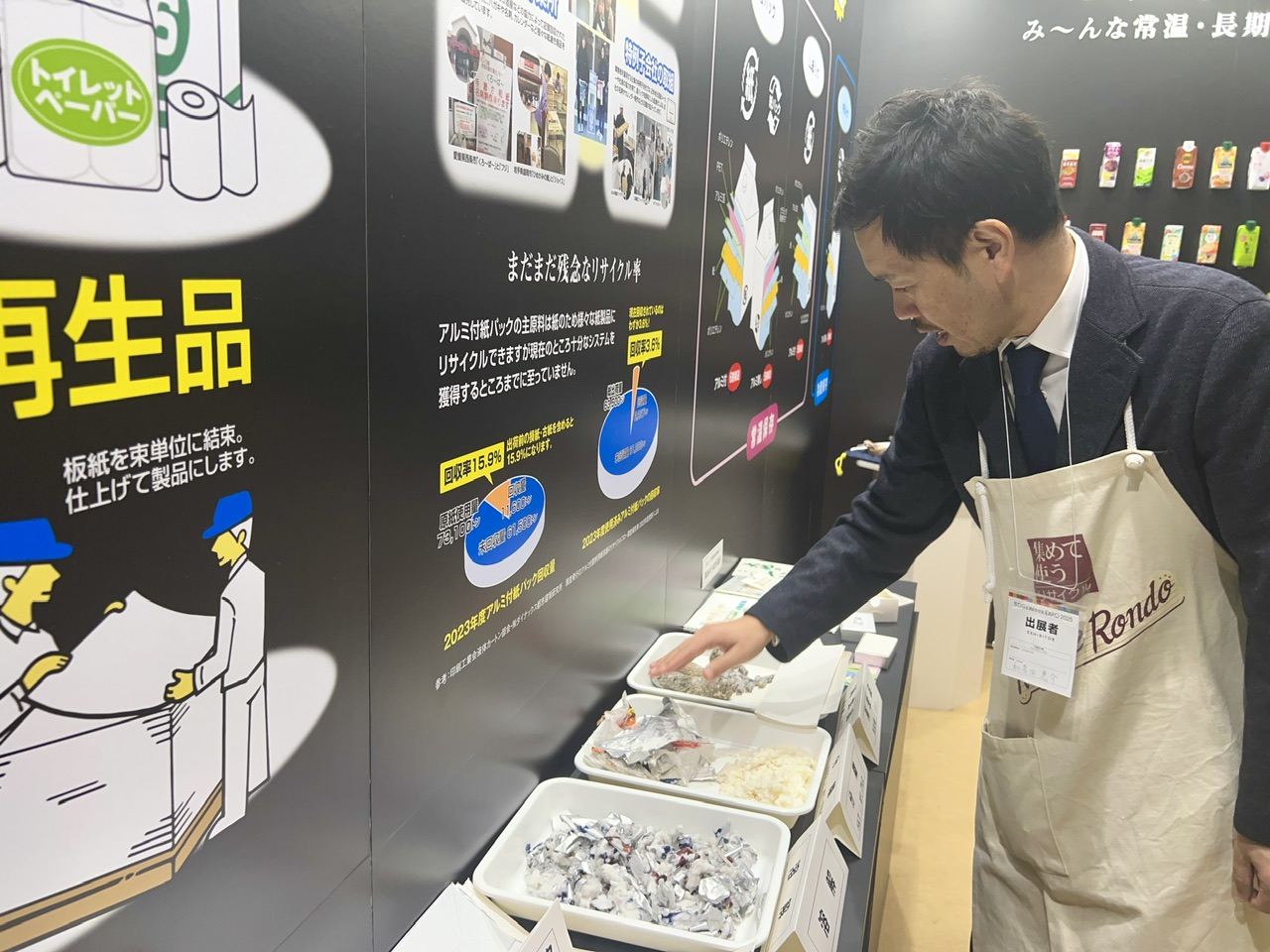 回収の仕組みが整備されずに、その多くが「ごみ」として処分されていたアルミ付紙パック。会場には、多くのリサイクル企業が出展する中で、特にリサイクルが難しいとされるアルミ付紙パックの「アルミ付紙パックリサイクルプロジェクト」に注目しました。