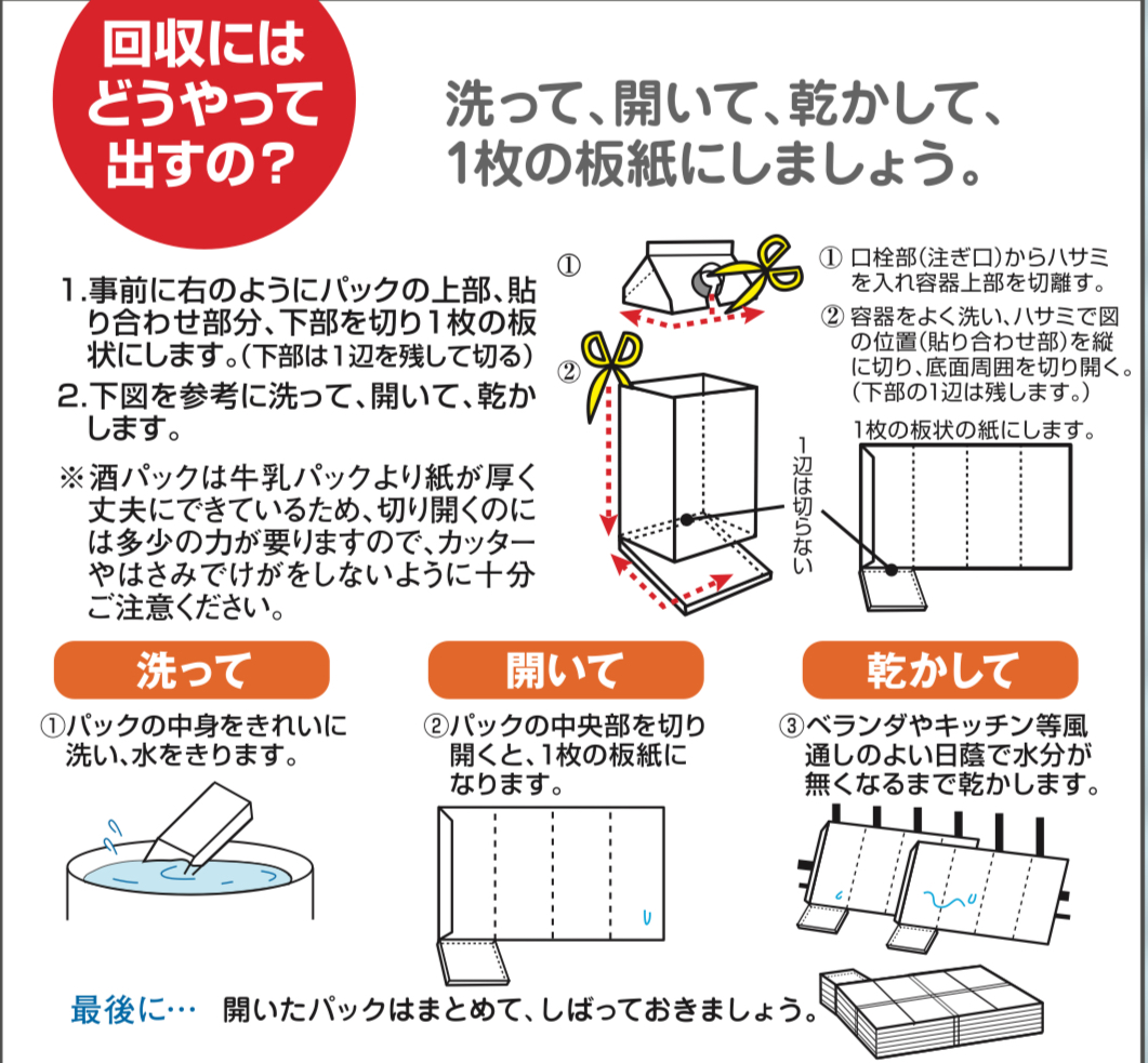 そこで、まずは、酒パックの回収からはじめ「エコ酒屋」が誕生。 今ではスーパーや生協、一部の自治体などでも回収に取り組む所が誕生し、リサイクルの輪が拡がって来ています。