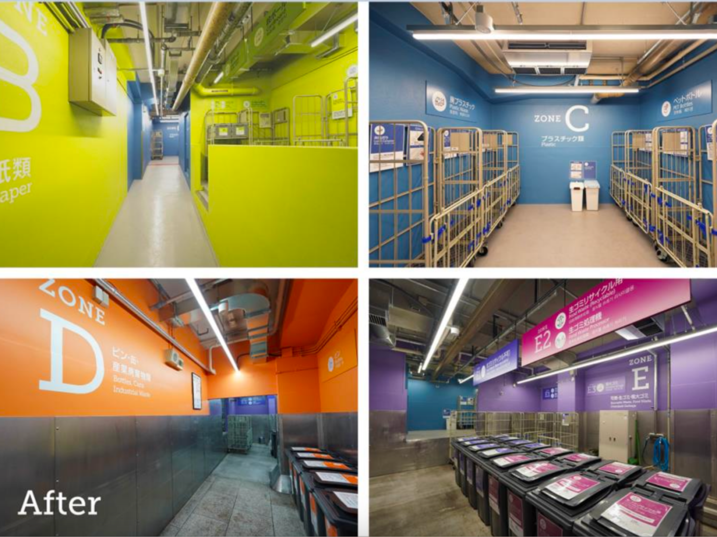 リニューアルのポイントは、塵芥処理室の壁を色で区切って、どこに何のごみを捨てるのかを視覚的にはっきり示した点です。