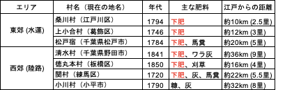 表2は、江戸近郊の肥料の利用状況です。これを見ると、江戸の東の近郊で下肥がよく使われ、下肥のみの村もある一方で、西側では、それ以外の肥料も混じっていたことがわかります。
