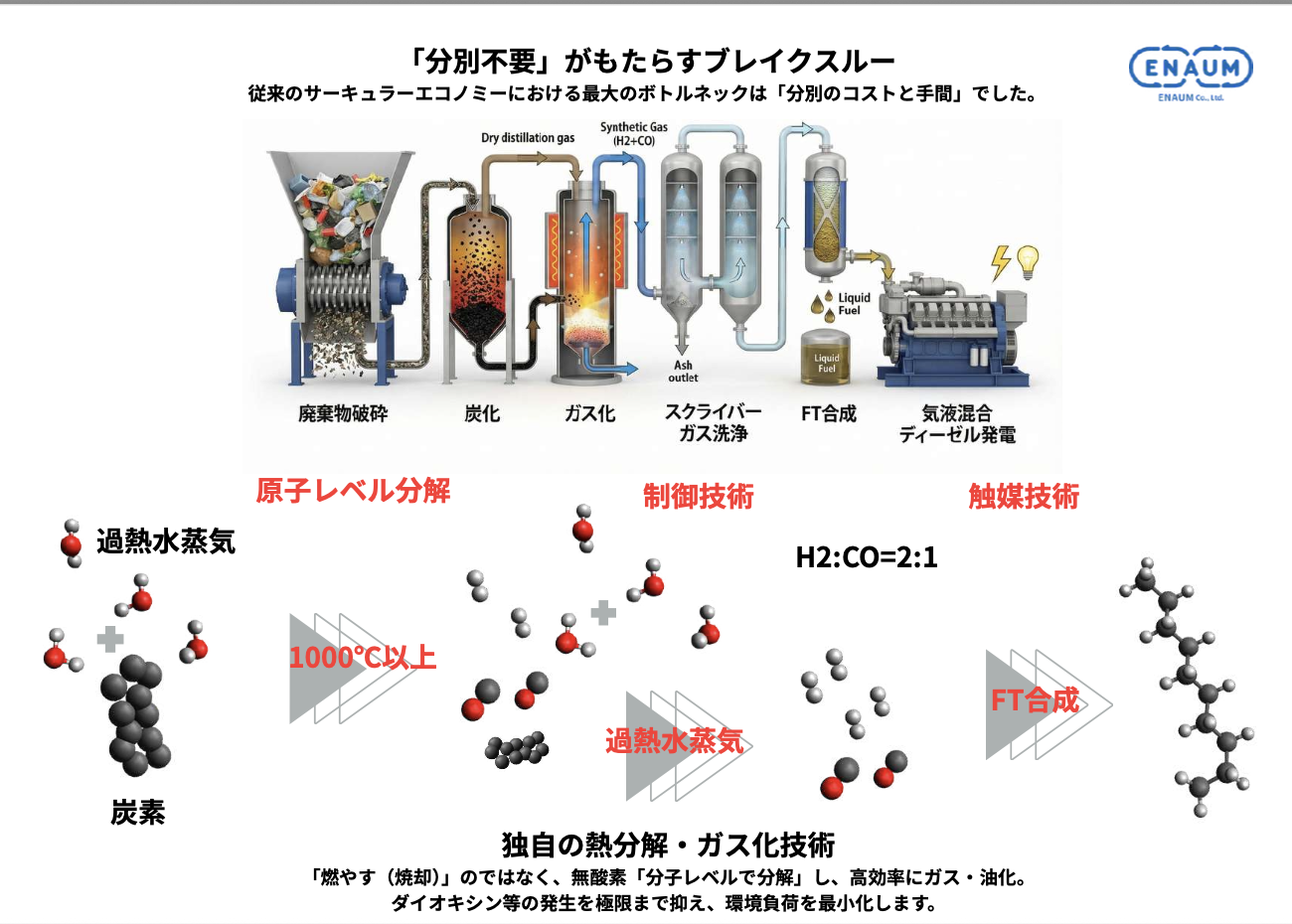 まず廃棄物を適度な大きさに粉砕し、無酸素状態で加熱して炭化します。その炭に過熱水蒸気を入れることで、シンガスと言われる水素と一酸化炭素のガスに合成していくんですが、ここで特許技術により制御して2:1の理想的な状態にしていきます。これを合成触媒で直鎖状の炭化水素に変えていくというプロセスです。