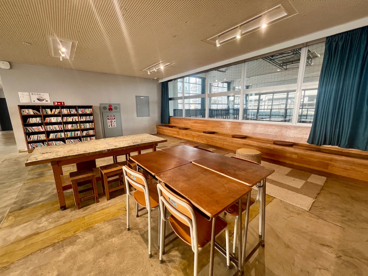 建物内に入ると、一気にノスタルジックな雰囲気に包まれます。お洒落にリノベーションされつつ、元学校の良さはそのままに残されていて、木製の本棚や黒板、机や椅子などがそのまま使われています。