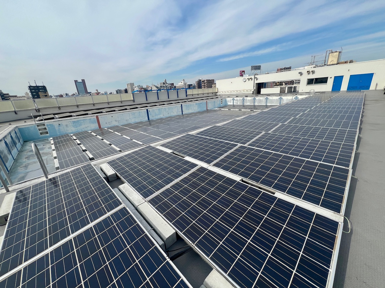 屋上プール跡地に太陽光発電所、リユース品を利用